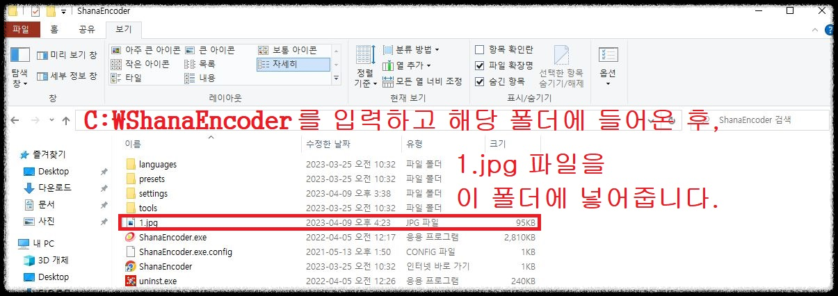 4. 방금 이름을 변경한 "1.jpg" 파일을 [C:\ShanaEncoder]경로에 넣어줍니다.